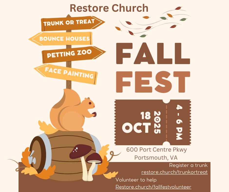 Restore Church is hosting an annual Fall Festival with Trunk or Treat included.